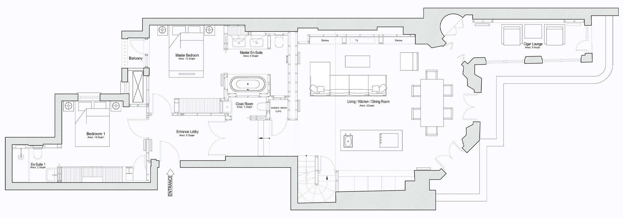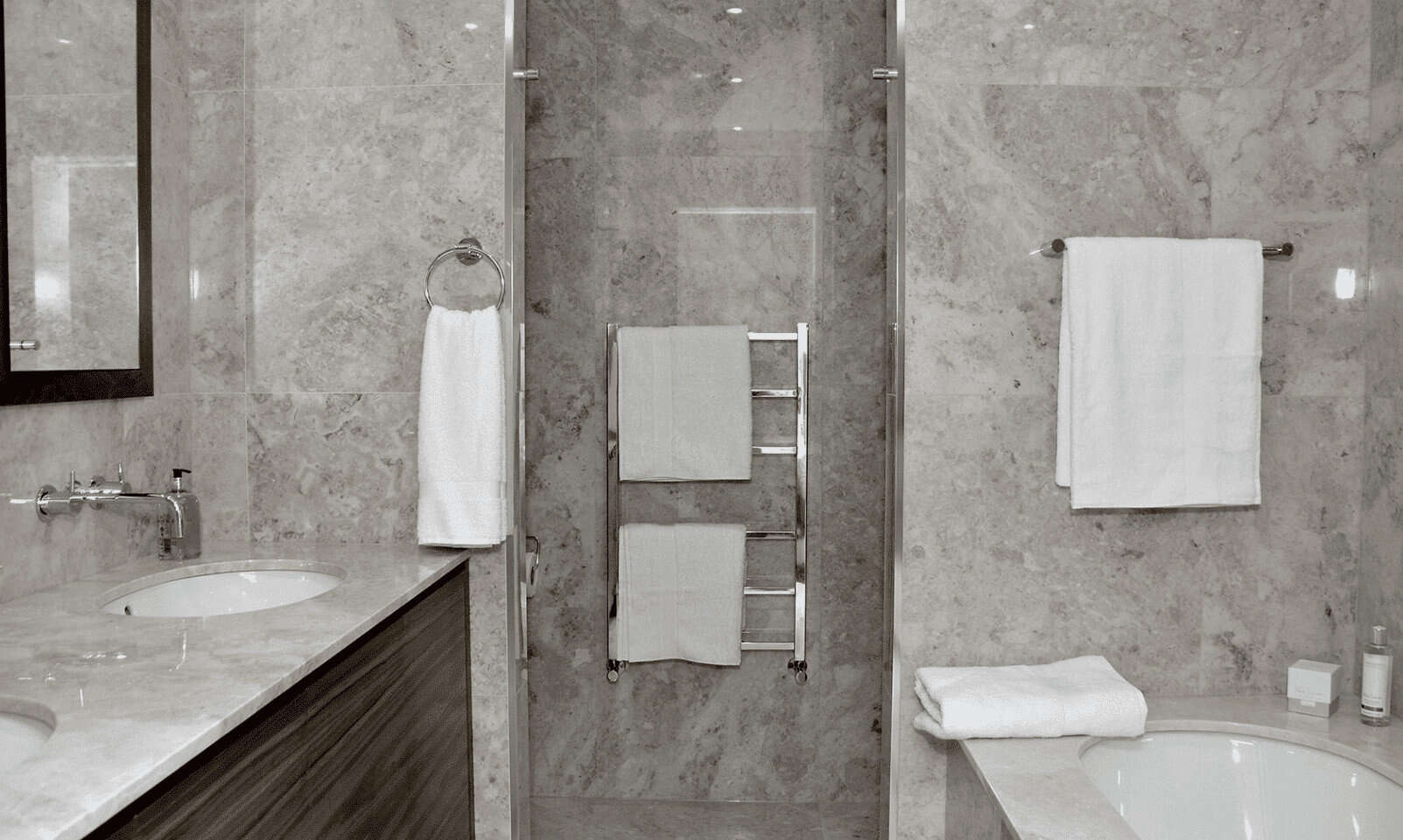 This client sought marble lined walls in the bathrooms and marble flooring with underfloor heating throughout. An impact resistant glass balustrade was installed for the mezzanine, removing the need for any railing, so that the two floors appear as one flowing space.